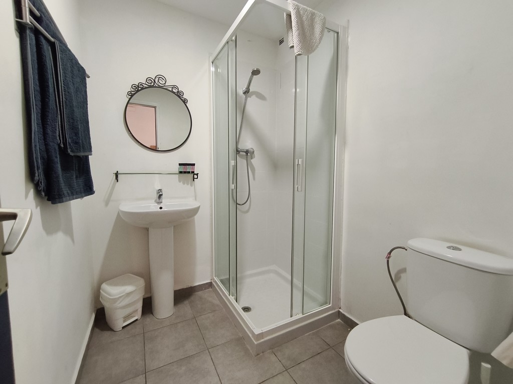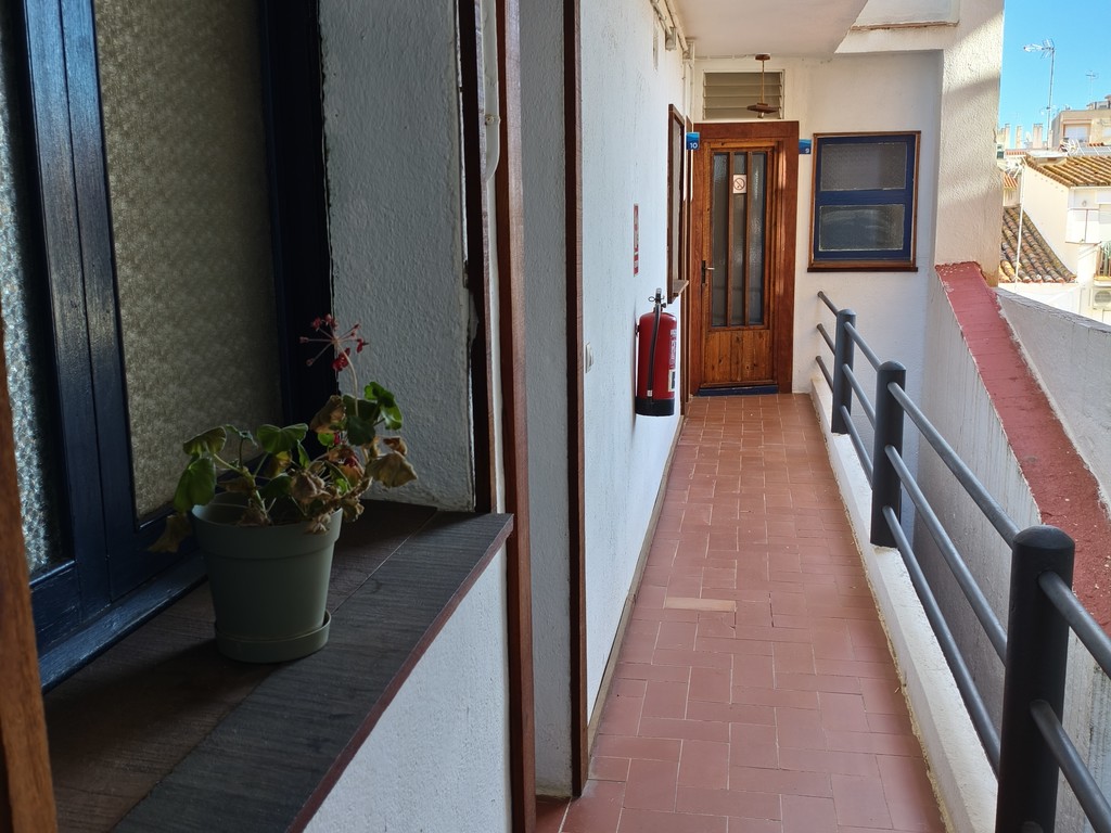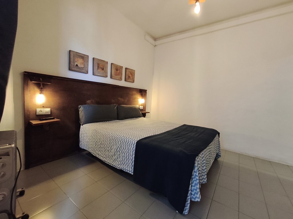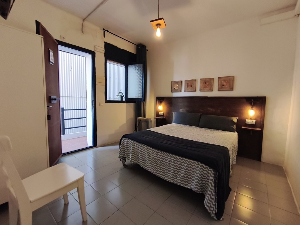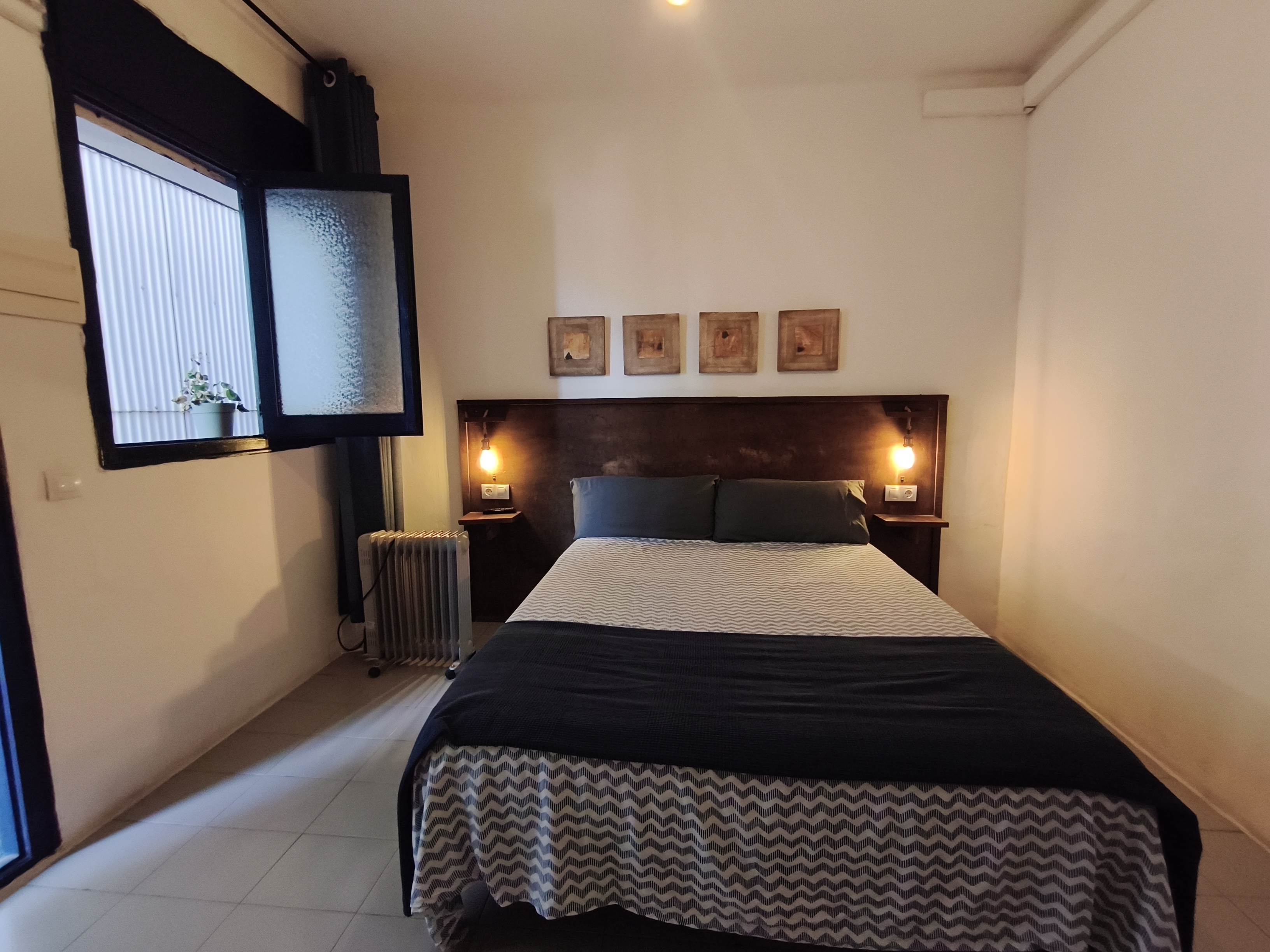 Habitación interior doble con cama de matrimonio y baño con ducha privada en segunda planta. Habitación interior doble número 11 con cama de matrimonio sin vistas en nuestro "Hostalet" del centro de Canet de Mar, Barcelona, a 100 m de la playa, a 50 m de la estación y a 50 km (45 minutos) del centro de Barcelona.