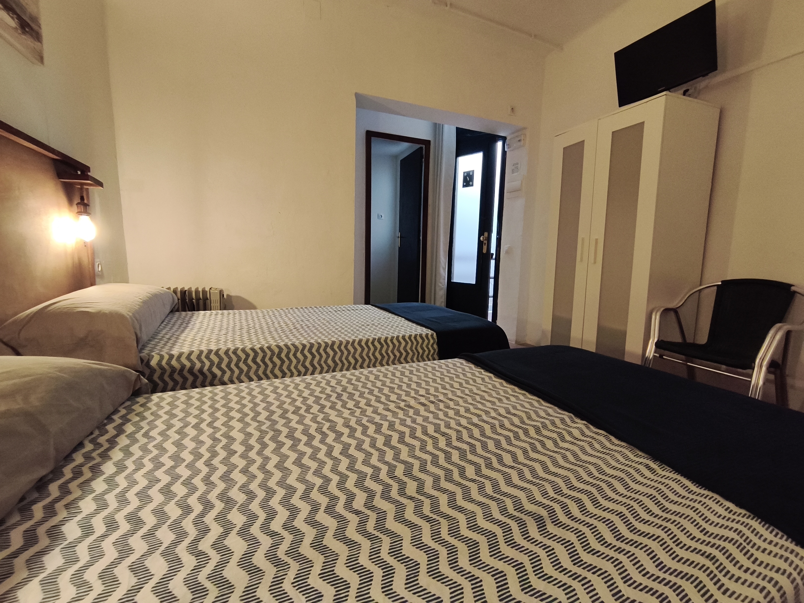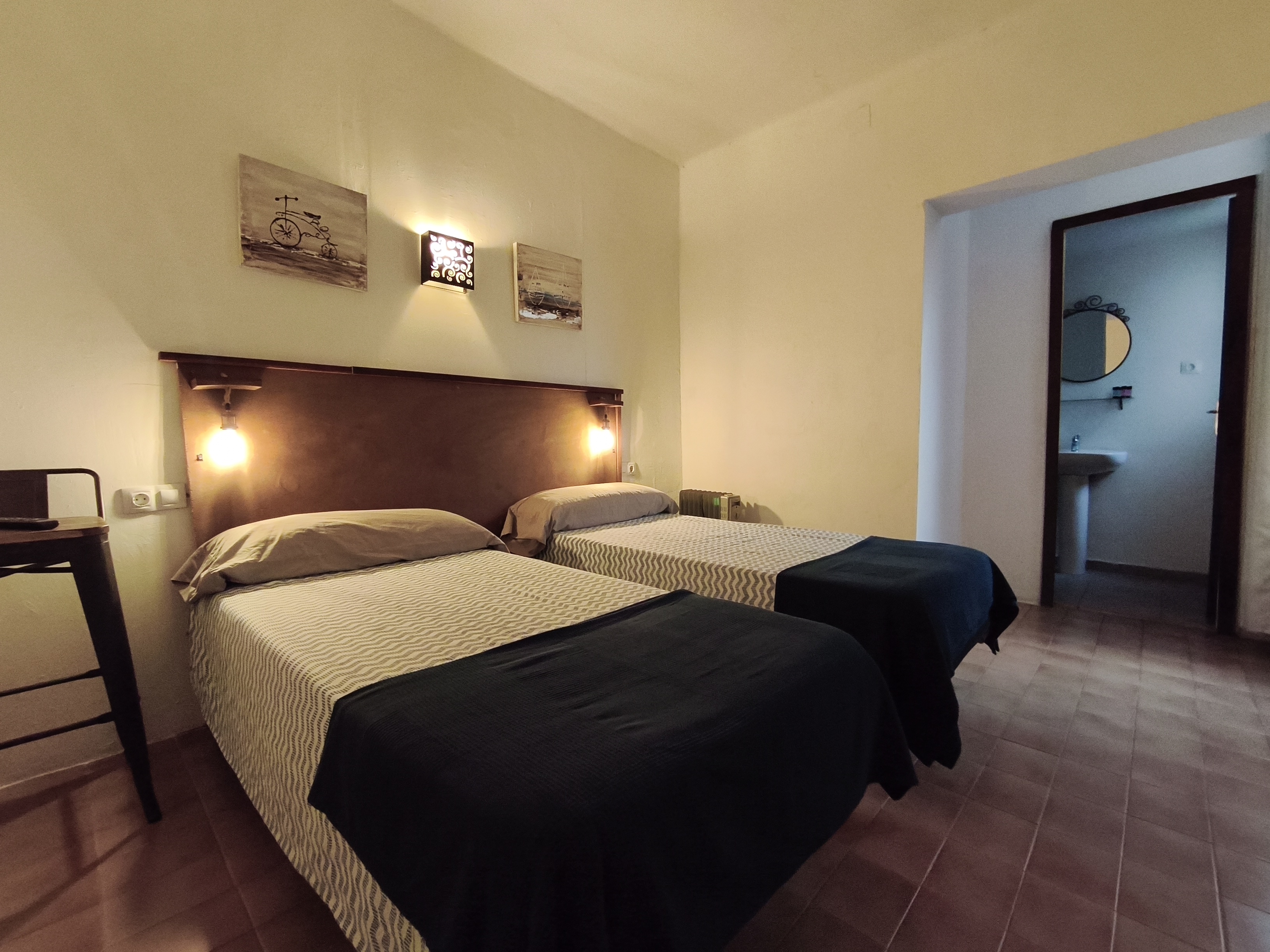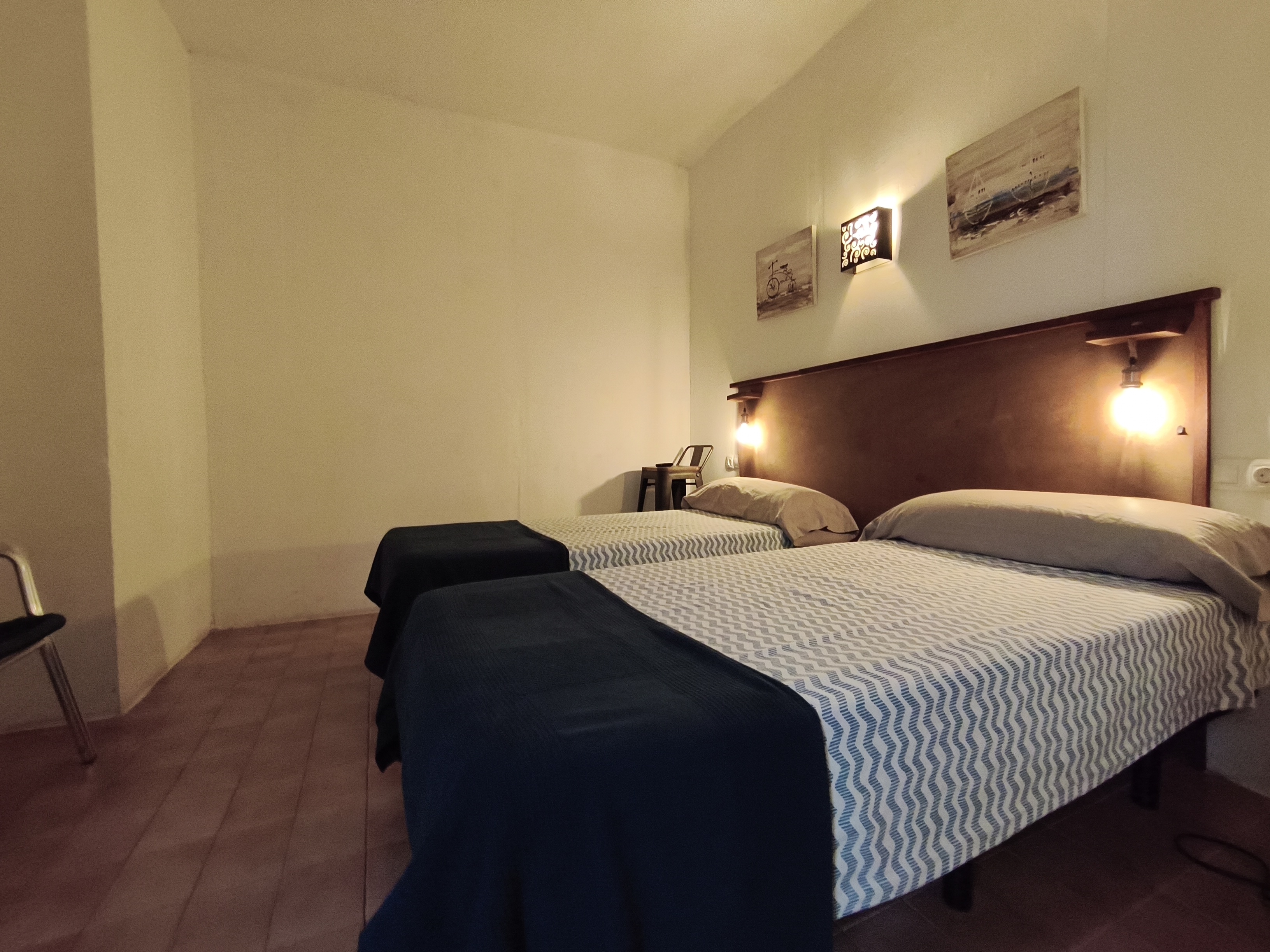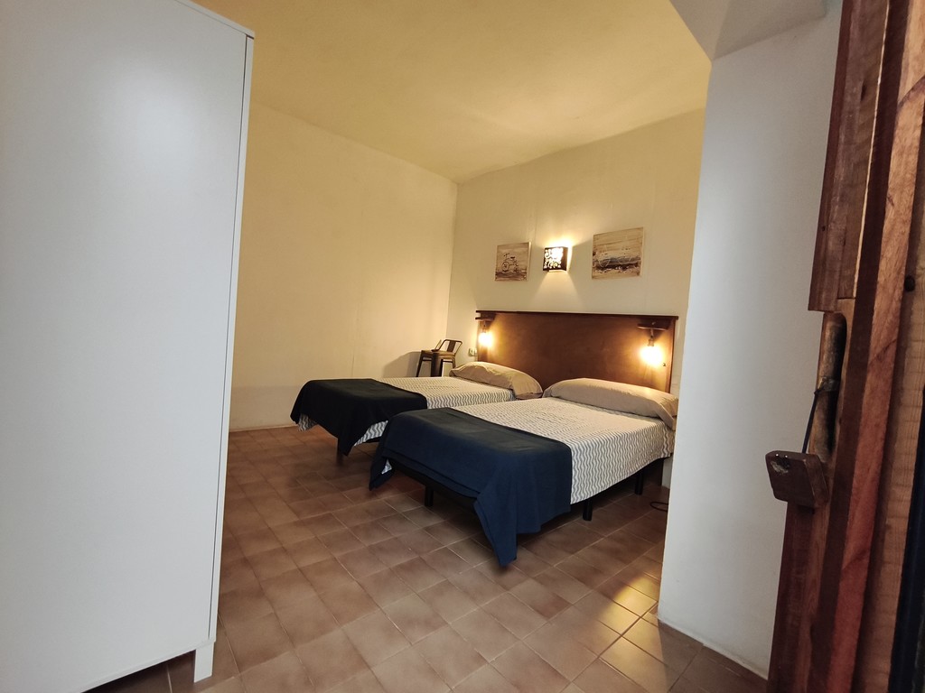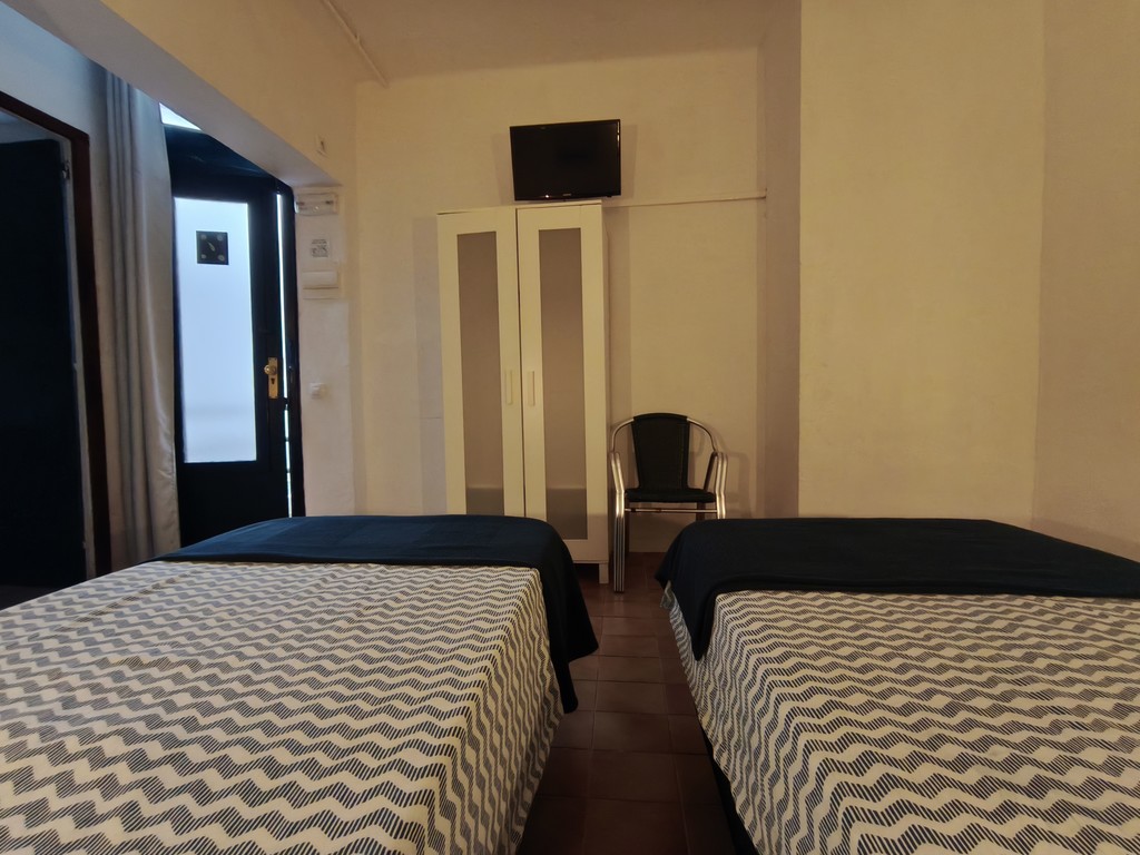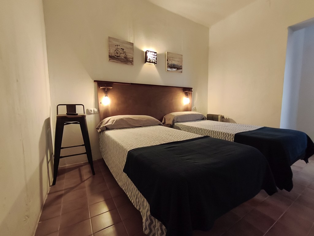 Habitación interior doble con camas individuales y baño con ducha privada en segunda planta. Habitación interior doble número 4 con cama de matrimonio sin vistas en nuestro "Hostalet" del centro de Canet de Mar, Barcelona, a 100 m de la playa, a 50 m de la estación y a 50 km (45 minutos) del centro de Barcelona.