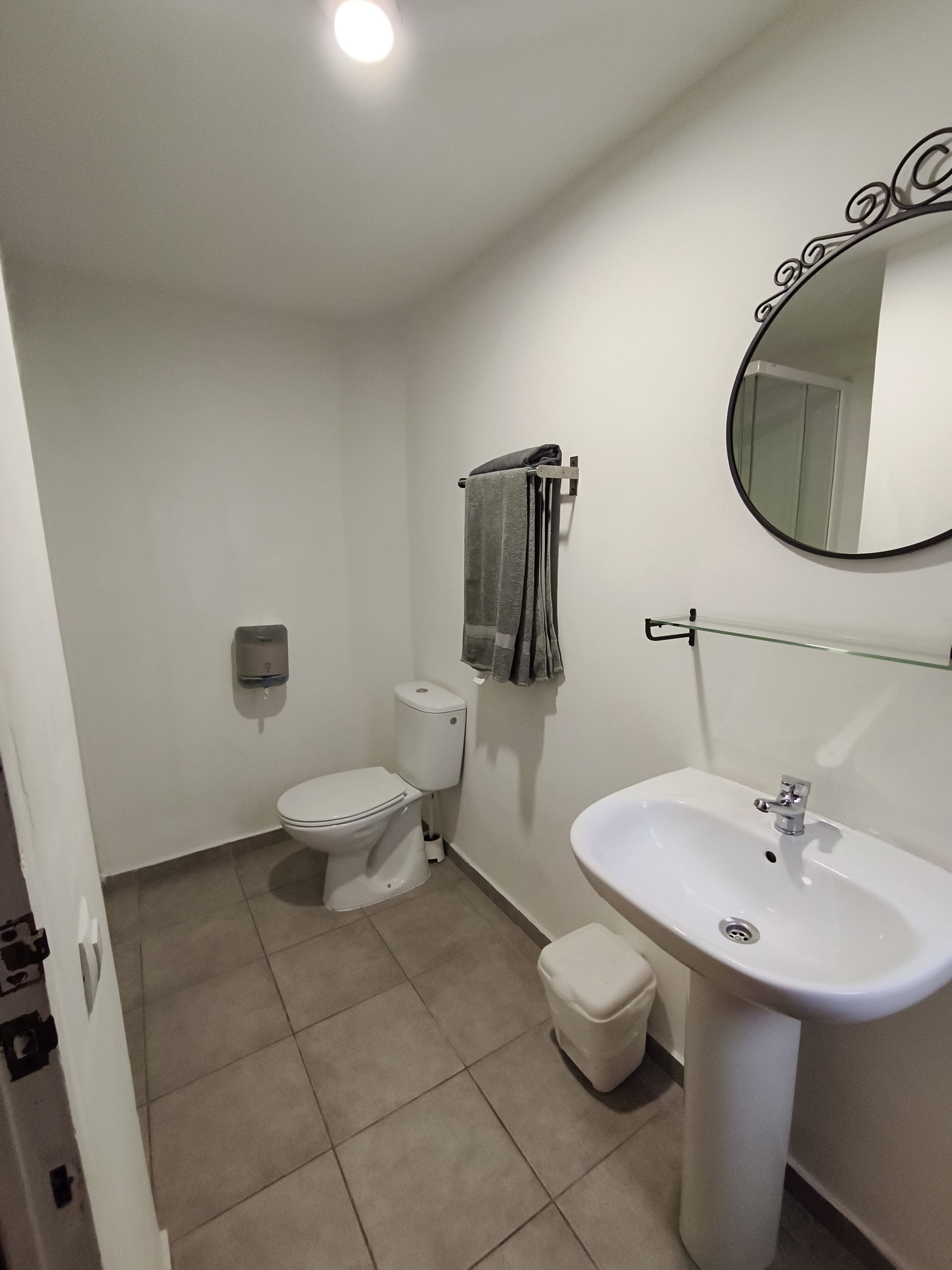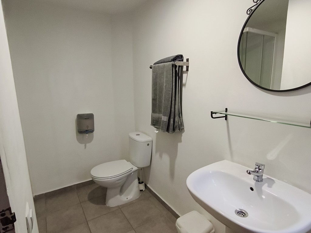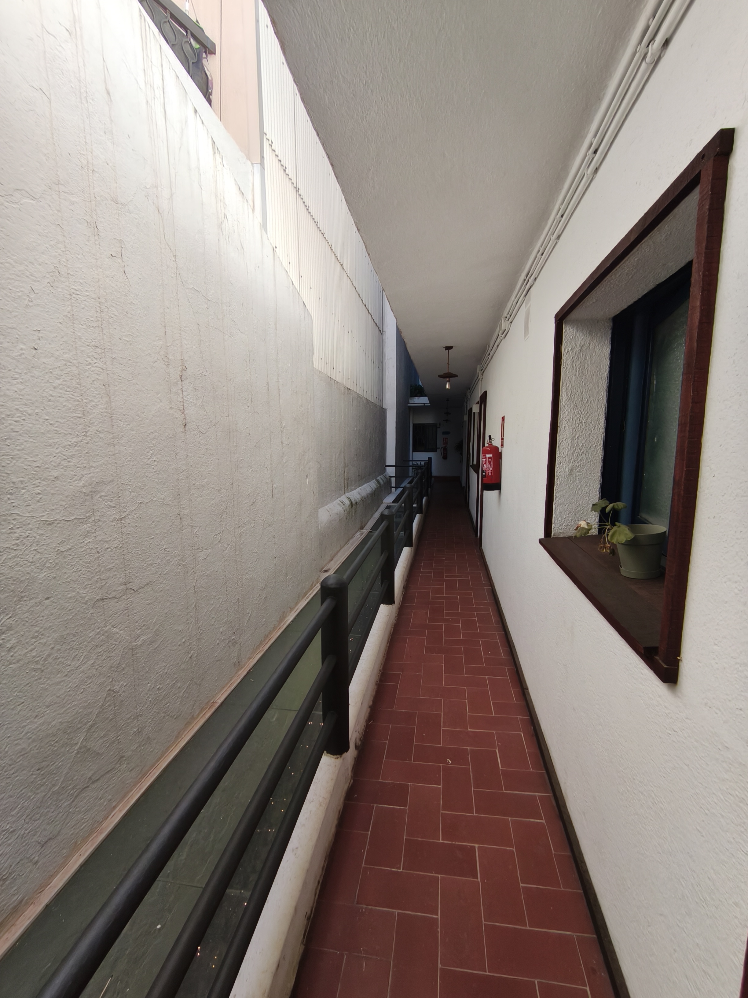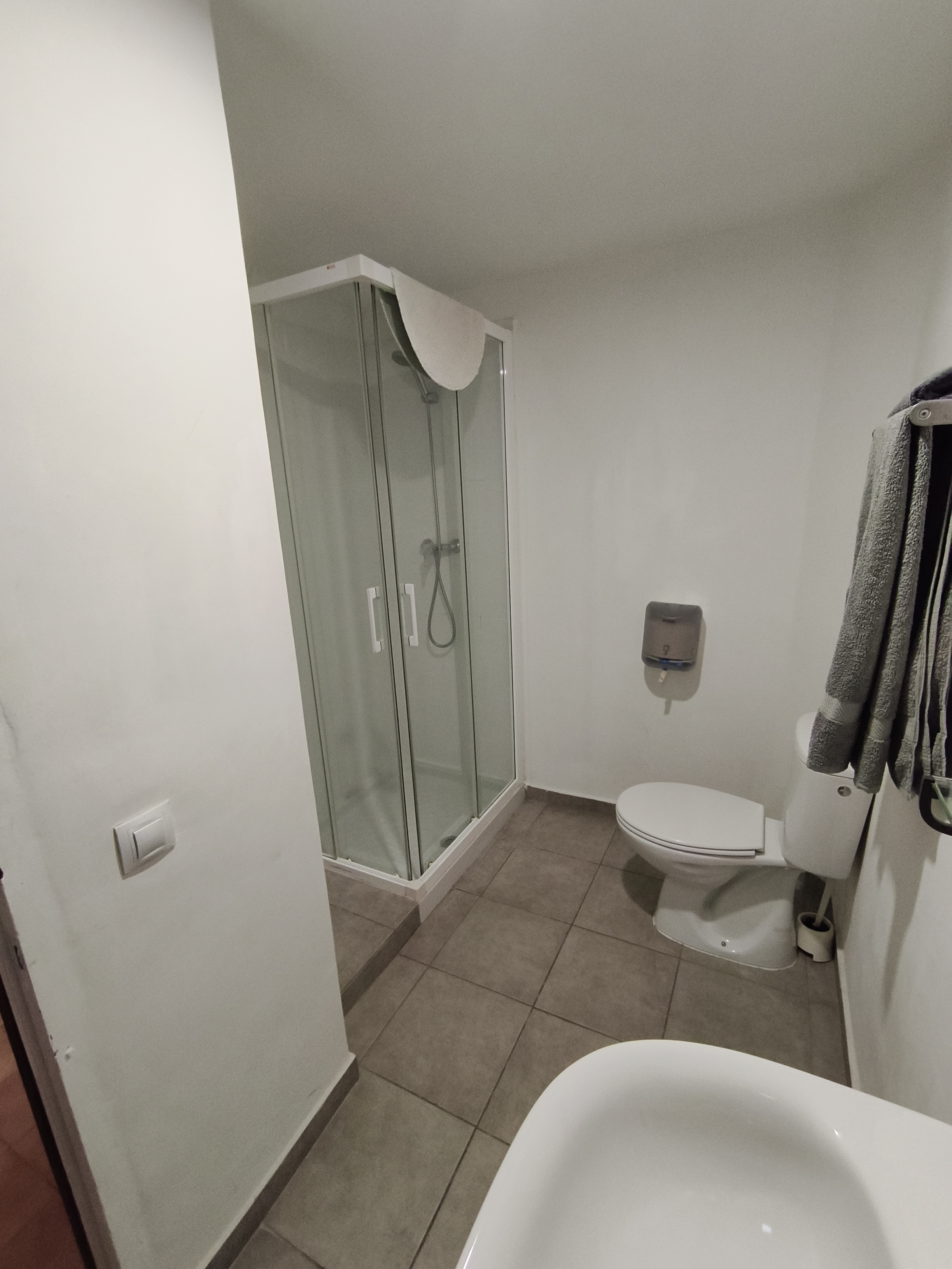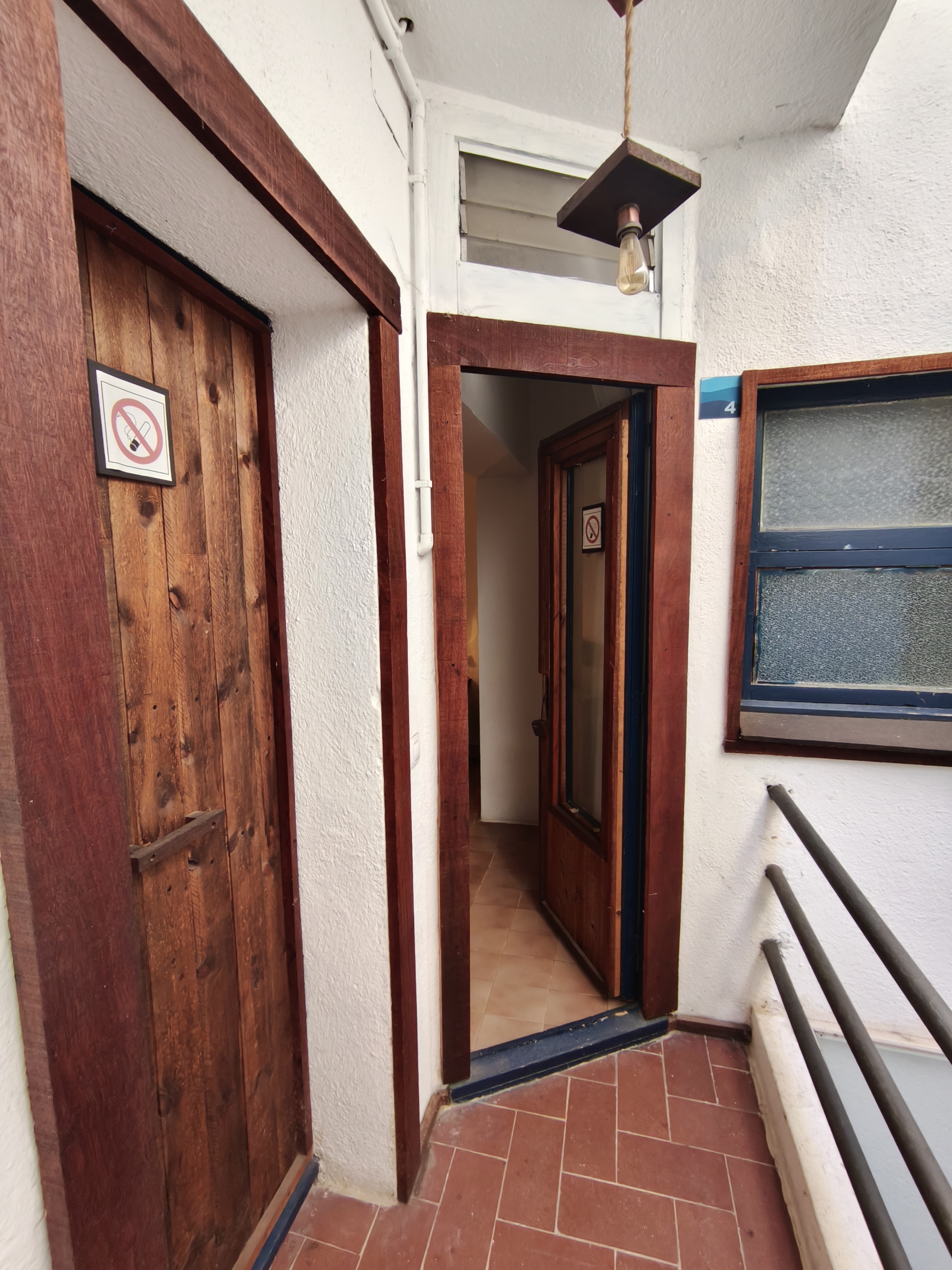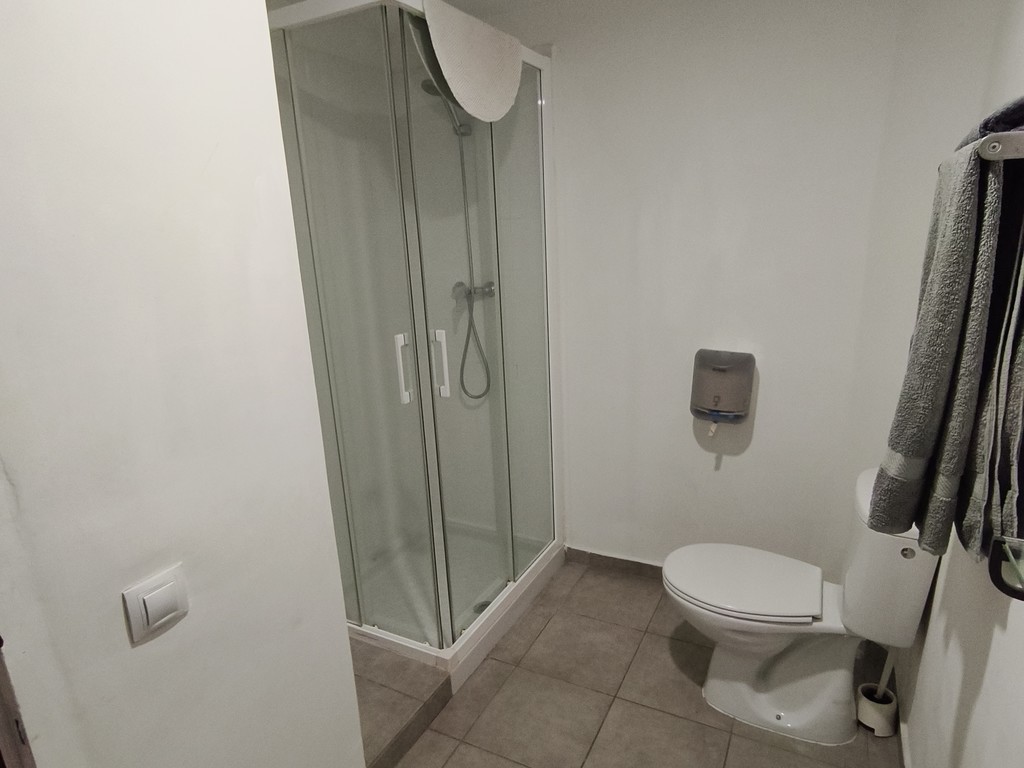 Habitación interior doble con camas individuales y baño con ducha privada en segunda planta. Habitación interior doble número 4 con cama de matrimonio sin vistas en nuestro "Hostalet" del centro de Canet de Mar, Barcelona, a 100 m de la playa, a 50 m de la estación y a 50 km (45 minutos) del centro de Barcelona.